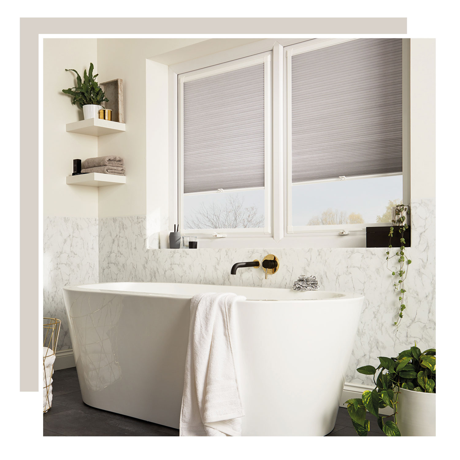 Marble promotes cleanliness and purity, perfect for rooms where hygiene is noted most! Reflecting natural light beautifully and brightening even the smallest of rooms, marble is a great choice for smaller bathrooms. Pictured, we’ve paired Cellular blinds in a Perfect Fit frame to ensure a smooth, seamless finish. Or, opt for our popular marble roller for a luxurious centre-piece.