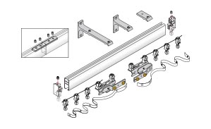 - The tracks are supplied as standard with master carriers and 14 x wheeled smooth running ball bearing runners per meter. The Master Carrier ensures maximum drive stability and the arms can be configured to suit a variety of applications and curtain stacking options (straight and overlap for center split, straight arm for a left or right stack)